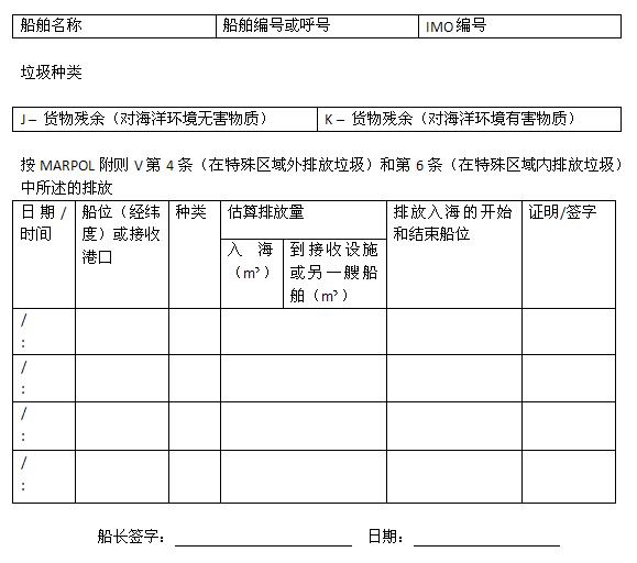 (一)《垃圾記錄簿》不論是船舶正式航海日志的一部分,還是其他形式,均應(yīng)與修正案附錄II格式相同。新版《垃圾記錄簿》電子版可在中國海事局網(wǎng)站下載。