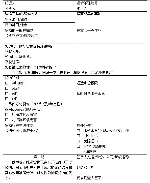 船方應(yīng)當(dāng)要求托運(yùn)人對其托運(yùn)的貨物是否對海洋環(huán)境有害進(jìn)行申明(申明格式見附件2),并將申明隨船保存至少兩年。